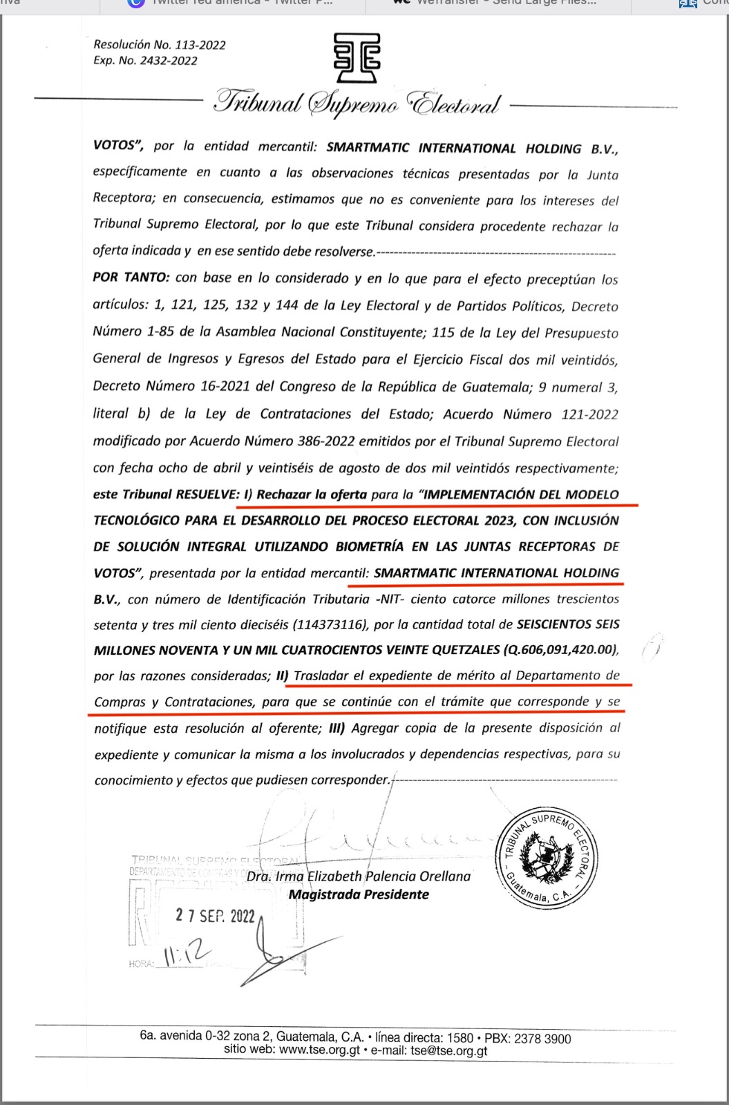 Se presentaron dos apersonamientos con acompañamiento legal para hacer ver a los magistrados del Tribunal Supremo Electoral que sus actuaciones reñían con la Ley, tanto en la adquisición del software Smartmatic como en la adquisición de Equipo utilizando las excepciones de la Ley de Compras y Contrataciones.