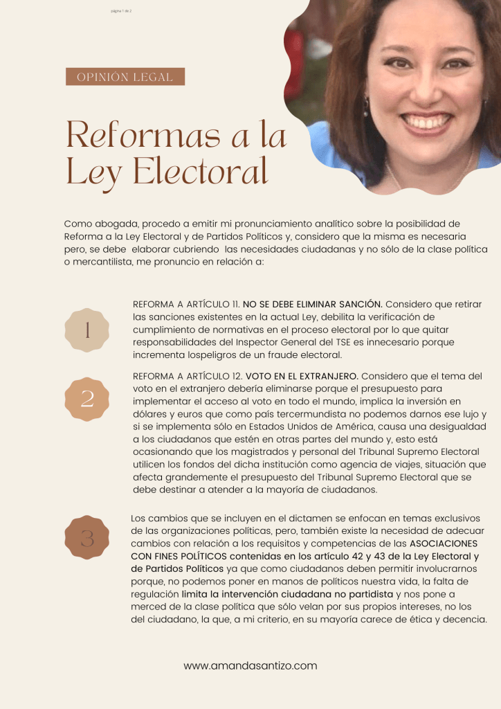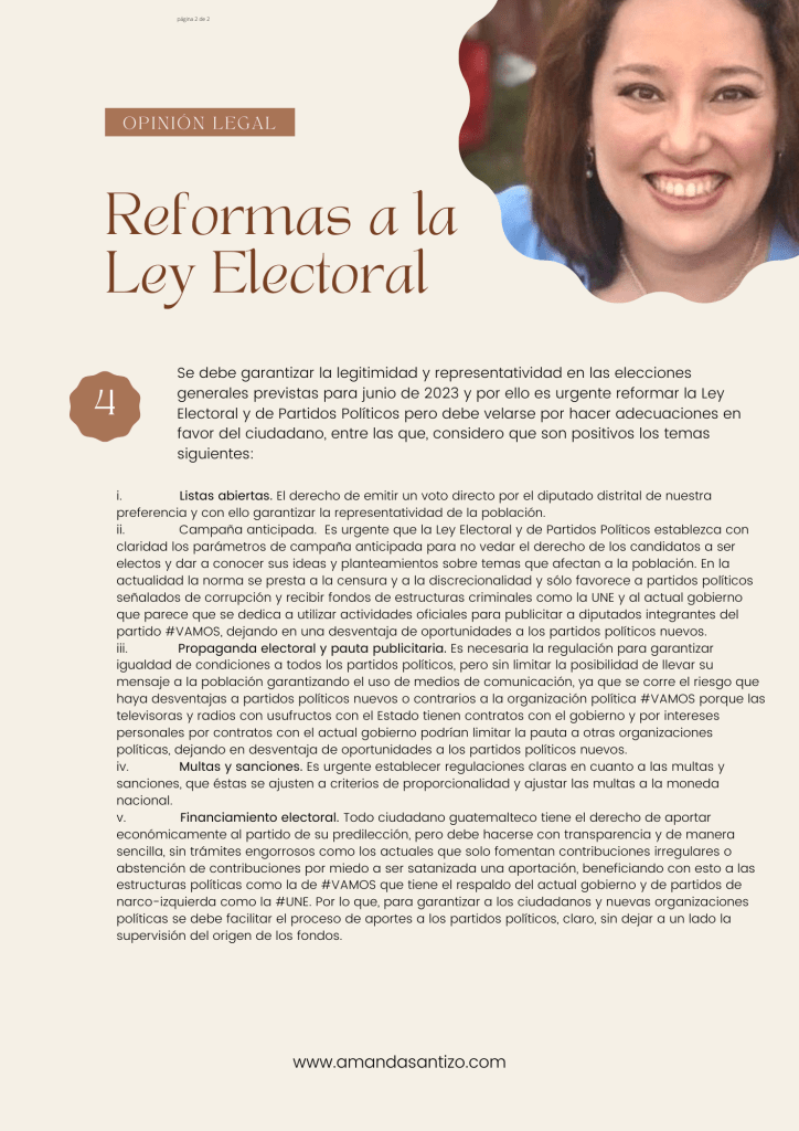 Como parte de nuestra contribución con el respeto al derecho de elegir y ser electo, nos acercamos a la Comisión de Asuntos Electorales del Congreso de la República y entregamos un documento redactado por nuestro equipo legal, en el que se aportó en temas a considerarse en el dictamen de Reforma Electoral. Se enfatizó en la importancia de ampliar la regulación de asociaciones políticas ya que la escueta regulación actual limita la intervención ciudadana apolítica en las decisiones dentro del proceso electoral, también se recomendó analizar todo lo que reformó la CICIG en el tema electoral ya que dicha Comisión bajo la dirección de Iván Velásquez Gómez hizo reformas para beneficiar a la candidata Thelma Aldana que pretendía ser presidente y por eso creo normativas perjudiciales para partidos nuevos y sin cobertura de la vieja política.